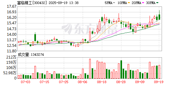 9月19日早盘,富临精工(300432.SZ)股价一度大涨近8%,报17.14元/股,随后震荡走低。截至午间收盘,富临精工涨19.5%,报16.17元/股。